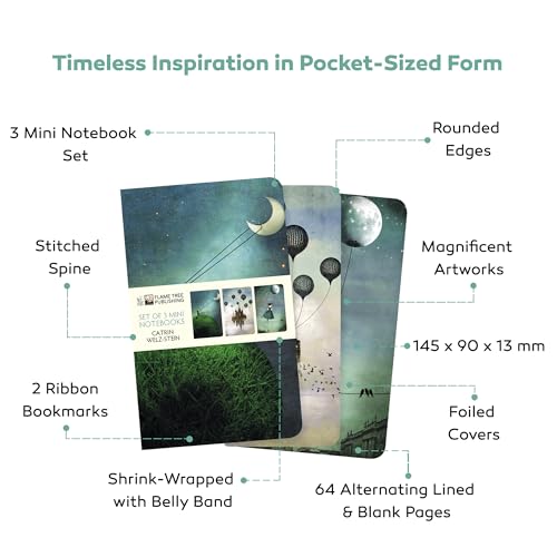 - The Mini Journal Notebooks You Can Easily Carry: Our blank and lined notebook collections are small enough to fit in your bag or pocket. These make good writing journals for anyone taking creative writing lessons or a doodle journal for the aspiring artist., Never Rummage for Paper Again: Always be ready with a backup notepad on hand with this set of mini notebooks pocket size. Each features a beautifully embossed foiled art cover with round edges — it’s a writing pad with character., Compact and Practical Aesthetic Notebook: Aside from gorgeous covers, each pocket notebook contains 64 pages of alternating blank and lined high quality paper. These are a great addition to anyone’s collection of notebooks, writing pads & diaries., An Elegant Journal Set Worth Collecting: Each cute notebook pack is a great gift for art aficionados. Collect notebooks themed after well-loved characters and stories like Alice in Wonderland and Moomin or masterpieces from artists like William Morris, Angela Harding, and Frida Kahlo., Bringing the Art of Fine Gifts: Flame Tree offers beautiful and practical stationery to lift everyday. Explore our captivating range of designs that ignite creativity and elevate your writing experience.