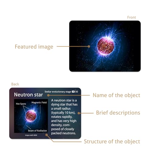 - ✅ COMPREHENSIVE: 52 flashcards cover all planets in the solar system, some minor planets, famous natural satellites, galaxies, clusters, and nebulae., ✅ INFORMATIVE: One side displays an image, the other side displays the name (with abbreviation or astronomical symbol), structure, and brief descriptions about the object. Both sides are printed in full-color with high-resolution photos taken from NASA. Item includes a sheet of Universe Infographic for your easy reference., ✅ VALUABLE: Durable paper with glossy coating, water and tear resistant., ✅ CONVENIENT: Standard playing card size, easy to carry., ✅ WORRY-FREE: 100% Satisfaction Guarantee & Lifetime Warranty.