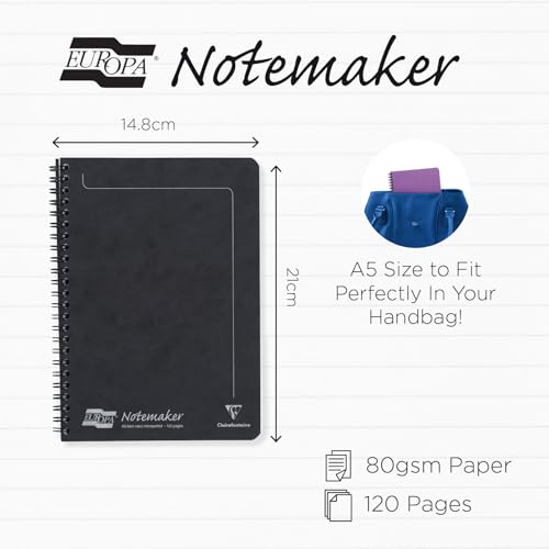Clairefontaine - Europa Notemaker Spiral Notebook - A5 5.8” x 8.3” - 120 Lined Detachable Pages - 90gsm Brushed Vellum Paper - Premium Pressboard Cover - Black - 4852Z