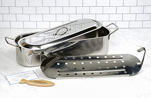 - GREAT FOR THE KITCHEN: The removable inner rack's long handles make it easy to lift out cooked dish without is flaking apart., PERFECTLY POACHED: Prepare an elegant meal of whole salmon, snapper, or striped bass, or cook vegetables with a fish steak or fillets, and serve over hot rice., PERFECTLY SIZED: Measures 20 inches in length by 6.5 inches wide by 4.5 inches tall., FANTASTIC QUALITY: Large fish poacher pan is made from commercial quality stainless steel., EASY TO USE AND CLEAN: Dishwasher safe for quick and easy clean up.