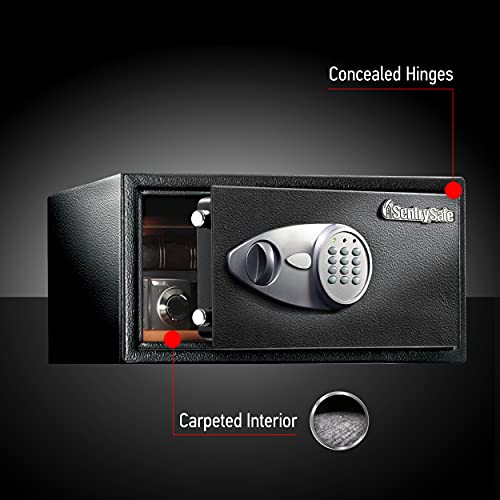 - Protect your valuables with this home security safe, complete with carpeted interior, removable shelving, and power cord access for security while charging your devices; use as a personal home safe, laptop safe, or jewelry safe, Set your own digital combination security safe for protection from theft or burglary, Home safe features two live-locking bolts, steel construction, concealed hinges, and bolt down hardware, Exterior: 16.9 in. W x 13.6 in. D x 8.9 in. H; Interior: 16.8 in. W x 11.6 in. D x 8.7 in. H; large 0.98 cubic foot capacity; weighs 24 pounds, For optimal performance, SentrySafe recommends the use of four high-quality, name branded, alkaline AA batteries with an expiration date of 8-10 years from the current year. Generic and rechargeable batteries often do not have the lifespan needed to support long term usage
