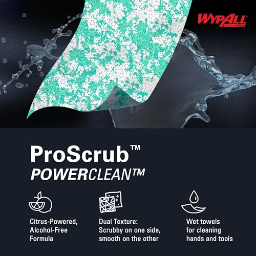 - 50 Sheets/Canister; 8 Canisters of WypAll PowerClean ProScrub Heavy Duty Wet Towels/Case; 400 Sheets/Case; Green and White; Dual Action Cleaning; Large 9.5" x 12" Wipes; Wipes & Free Canister, Easy, handy clean-up of tough soils from hands, tools & work surfaces., Features a scrubby side to lift up the toughest grime and a smooth side so nothing's left behind., Citrus-powered cleaning formula; Alcohol-free, dermatologist tested., Extra large size to remove heavy grease, glue, oil, marker, paint, tar and more.
