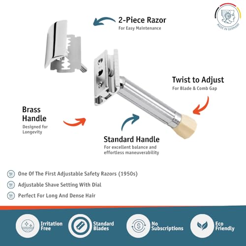 - The angle of the blade can be altered by simply twisting the handle to one of the six settings featured, Guaranteed to leave you with blemish-free skin and an ultra close shave, Compatible with all other standard double edge blades