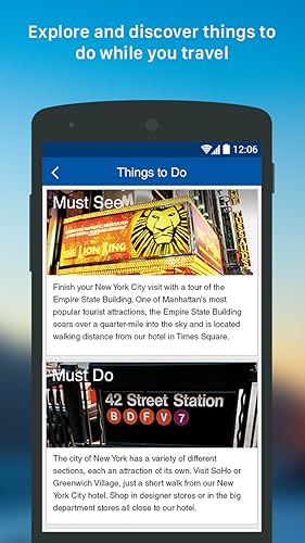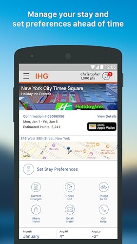 - Manage every step of your stay; from communicating with the hotel and setting preferences, to transportation, dining, and area attractions., Guest reviews from travelers just like you to help you find the perfect hotel for your stay., Access to special IHG offers and discounts., View your current charges during your stay*., Trouble-free, convenient departures via Mobile Check-Out, plus an instantly emailed copy of your bill*., View your past stays, check on points earned, and access your hotel bill., Use IHG Rewards Club points to redeem free Reward Night stays, Digital Rewards downloads and much more, Track your IHG Rewards Club points balance and progress towards Elite status., Turn your phone horizontally to show your IHG Rewards Club or Ambassador card., Get special rates using your corporate ID.