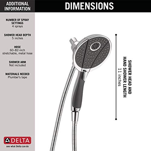 - Hand shower and shower head in 1: The In2ition 2-in-1 dual shower head allows you to use the detachable shower head with hose separately or securely docked for a luxurious and versatile showering experience, Intensely powerful: Immerse yourself in the steady, intensely powerful full body spray with forceful streams of water to satisfy all of your showering needs, Massaging jets: Relieve sore, tired muscles with focused, invigorating massaging jets for the ultimate showering experience, 4 powerful spray options: Shower head spray settings include full body spray, fast massaging spray, full body spray with massage, and pause, LIFETIME LIMITED WARRANTY: You can install with confidence, knowing this Delta handheld shower head with hose is backed by Delta Faucet's Lifetime Limited Warranty