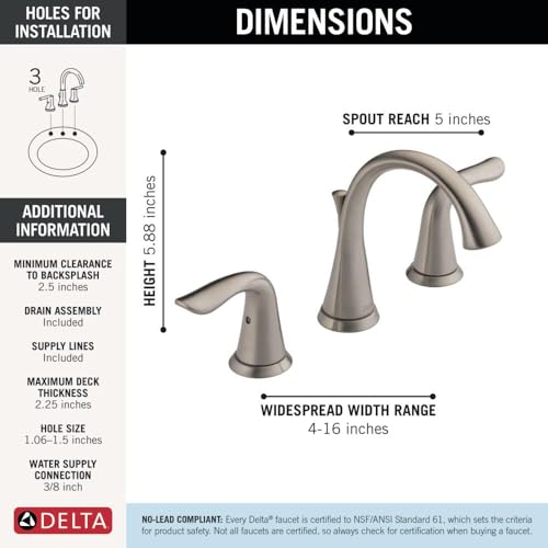 - LASTS 2X LONGER: DIAMOND Seal Technology uses a patented design to reduce leak points and last twice as long as the industry standard (Industry standard is based on ASME A112.18.1 of 500,000 cycles), SUPPLY LINES INCLUDED: InnoFlex PEX supply lines are integrated into the faucet for one less potential leak point and are conveniently included in the box, REDUCE LEAKS: DIAMOND Valve, a diamond-embedded ceramic disc, requires no lubrication and eliminates wear on seals, so you can rest assured that this faucet will perform like new for life, EASY INSTALLATION: Designed to fit 3 hole, 4-16 in. widespread configurations. Everything you need is together in one box, including a coordinating metal pop up drain assembly, LIFETIME LIMITED WARRANTY: You can install with confidence, knowing this bathroom faucet is backed by Delta Faucet's Lifetime Limited Warranty