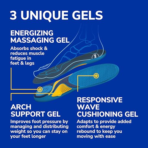 - Helps to relieve and eliminate tired, achy feet & legs, while helping to reduce foot pressure and muscle fatigue. Maintain your energy all day long so you can keep doing the things you enjoy everyday!, Clinically proven to provide all-day superior comfort in each of the 4 key areas of your foot – forefoot, mid-sole, arch & heel. These insoles can help double the comfort in your shoes, for those with foot discomfort., Our only insole with a patented triple gel design. 3 unique gels work together to provide maximum cushioning, shock absorption, and maximum arch support. The multi-layer Massaging Gel waves act like tiny springs to absorb shock, Great to use during any of your everyday activites. Whether you are communting, running errands, working around the house, or getting ready to have a night out - these insoles will help keep you on your feet for longer!, Flexible and lightweight design fits comfortably in your Work boots/shoes, Casual shoes, Dress Shoes, Flats, & Sneakers. Trim to fit Men's shoe sizes 8-14 and Women's 6-10
