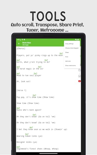 - offline access to favorite tabs, autoscroll, chord diagrams (guitar, piano and ukulele) with multiple variations and left-handed mode, tool for chord transposing, sharing, create and save your own song, history of browsed songs