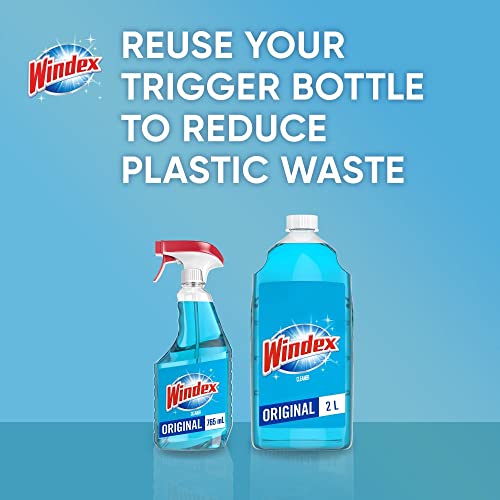 - EFFECTIVE CLEANER: Windex effortlessly tackles smudges, dirt, fingerprints, and various messes on windows, mirrors, stove tops, glass doors, vehicles, and tables, ensuring a spotless result every time you clean., STREAK-FREE SHINE: Trusted for generations, Windex glass and window cleaner solution not only removes grime but also lightens and brightens your house, leaving it with a sparkle that lasts., POWERFUL CLEANING PERFORMANCE: Starts working on smudges and smears even before you wipe., REFILL SOLUTION: Reuse trigger bottle to reduce plastic waste. The 2-liter glass cleaner refill bottle offers an economical solution, refilling the spray bottle nearly 3 times for an extended and sustainable use.