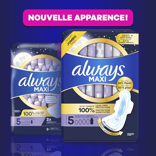 Always Maxi Overnight Feminine Pads with Wings for Women, Size 5, Extra Heavy Overnight Absorbency, Unscented, Up to 100% Leak-Free Protection, 27 Count