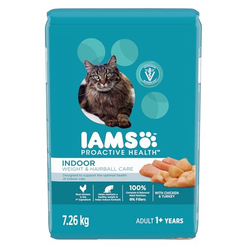 - IAMS PROACTIVE HEALTH Indoor Weight & Hairball Care, a 7.26KG bag of adult dry cat food, CHICKEN & TURKEY RECIPE with prebiotics, beet pulp and L-carnitine, PREVENTS HAIRBALLS FROM FORMING and helps your indoor cat maintain a healthy weight, 100% COMPLETE & BALANCED CAT FOOD with zero fillers, FEEL GOOD WITH IAMS, and trust that you’re giving your cat the nutrition they need