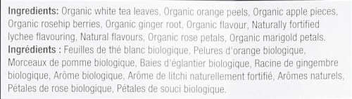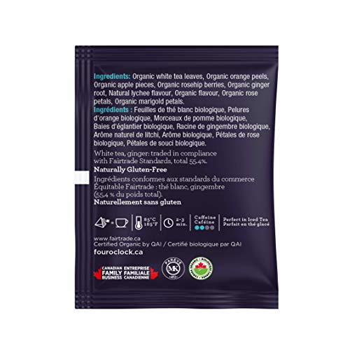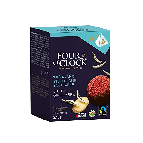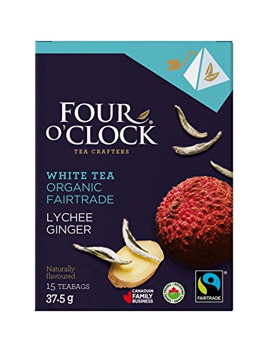 - A FLAVOURFUL EXPERIENCE - Four O'Clock's very own mixologist crafts tea blends that are spicy, sweet, herbaceous, woodsy, fruity and floral to suit your every mood. It is no wonder that this line is the #1 choice for great tasting ORGANIC FAIRTRADE teas., ALL NATURAL - Our NON-GMO teas have no added sugar, no artificial flavours and are allergen-free, gluten-free and kosher so you can enjoy a tasty cup guilt-free., A FOUR O’CLOCK MOMENT - Only the best quality ingredients are chosen from all corners of the earth. Each tea bag offers an unmatched experience to be shared with loved ones, creating the perfect Four O'Clock moment., INFUSION 101 - A Ginger Lychee WhiteTea should be infused for 2-3 minutes at 85°C-185°F. Each box has 15 PYRAMID tea bags that are optimally wrapped to conserve freshness for up to three years. Caffeine content: low., THE FOUR O’CLOCK PROMISE - We are a pioneering CANADIAN family company that crafts delicious teas since 1992. our tea bags are unbleached and compostable, and we use vegetable ink on our recyclable boxes made with recycled materials.