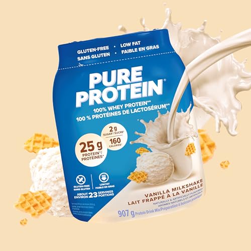 Pure Protein Whey Powder - High Protein (25 g/scoop), Low Sugar (2 g/scoop), Gluten Free - Fast-Acting Formula, Vanilla, 907g