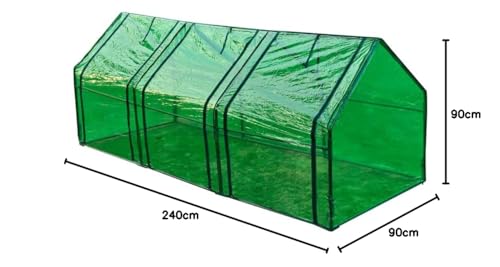 - ️UV protection and frost resistance to minimize weather-related damage; Not suitable for heavy snowfall -, Easy assembly with no special tools required; Lightweight and sturdy structure for hobby gardening -, 3 zipped wall doors for easy entry and air ventilation; Transparent cover for maximum sunlight exposure -, 【Dimensions】: 240 x 90 x 90 cm (L x W x H); Material: Powder-coated steel frame and tear- green PVC cover, ️Designed for leisure purposes and not intended as a permanent structure; Roof cannot withstand heavy snowfall