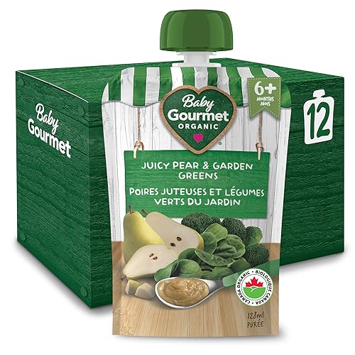 Baby Gourmet Juicy Pear & Garden Greens Purée, 12 × 128 mL Pouches | 6 Months+ | Organic Baby Food | No Added Sugar or Salt | Made in Canada