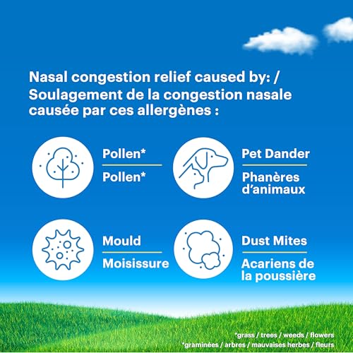 - Non-drowsy Claritin Allergy Decongestant provides fast, temporary relief of nasal congestion for up to 12 hours, Provides fast acting relief of nasal congestion caused by outdoor allergens such as trees, grass, ragweed and pollen and indoor allergens such as dust mites, animal dander and moulds, In a convenient nasal spray format, Claritin provides fast relief of nasal congestion due to cold, hay fever or upper respiratory allergies, The active ingredient in Claritin Nasal Decongestant is 0.05% oxymetazoline hydrochloride USP