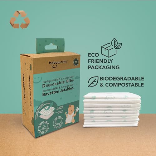 Baby Works Disposable Bibs with Crumb Catcher, 20 Count - Biodegradable and Compostable Baby Bibs - Quilted and Leak-Proof