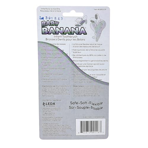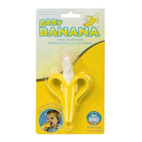 - Start teaching your baby good brushing habits with the Baby Banana Toothbrush! This training toothbrush is designed specifically for infants and toddlers small, sensitive mouths, This easy to hold toothbrush toy is made from a single piece of high quality, food grade silicone. It has been designed to be highly durable to withstand the rough handling of infants and toddlers, The soft silicone bristles will gently massage sore teething gums when the brush is rubbed against them. It can be put in the freezer to provide a soothing numbing effect for painful mouths. Designed to be easily cleaned in the top rack of the dishwasher, The Baby Banana has been carefully designed for little hands to hold. “Peels” allow you to attach a binky strap to the brush to prevent it from being dropped. If it does fall on the ground, rinse off and keep chewing, Proudly Made in USA, from 100% food grade silicone. BPA and phthalate free. Bendable silicone is safe for babies who bite down hard on a toothbrush. Measures 4.33" x 0.39" x 7.87