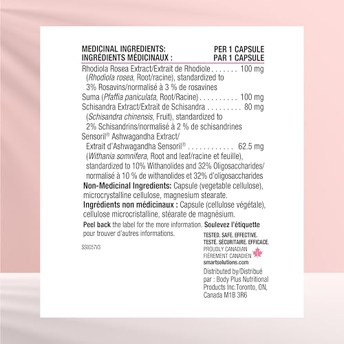 - TAILORED FOR WOMEN’S HEALTH: Adrenasmart is a comprehensive formula that offers support for physical and mental functions in anyone experiencing periods of chronic stress. Adrenasmart contains herbs that have adaptogenic properties, meaning they support the body and help bring it back into balance., RELIEVES SYMPTOMS OF STRESS: The adaptogens found in Adrenasmart support the adrenals which helps relieve symptoms of stress. Adrenasmart also help reduce cortisol and C-reactive protein levels, the biomarkers of physical stress., SUPPORTS COGNITIVE STAMINA & FUNCTION: Adrenasmart supports cognitive function and physical stamina. It also helps reduce the symptoms of stress such as fatigue, sleeplessness, irritability, and inability to concentrate, 100% QUALITY INGREDIENTS: No GMO, wheat, gluten, soy, artificial preservatives or sweeteners., A LEADER IN WOMEN'S HEALTH AND PROUDLY CANADIAN: Smart Solutions has been a leader in women’s health, empowering them to reach their optimal wellness for over 10 years. Care has gone into the selection of each ingredient, ensuring that every formula delivers results.