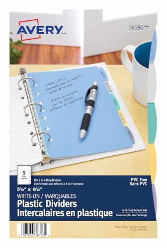 - Smaller 5. 5" x 8. 5" dividers for Mini Binders, Distinctive tab design provides ample room for labeling. Note: Not compatible with Printers, Write on tabs offer quick and easy customization using a ballpoint pen or pencil, Durable plastic allows for frequent reference, Distinctive tab design provides ample room for labeling, PVC Free