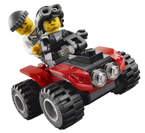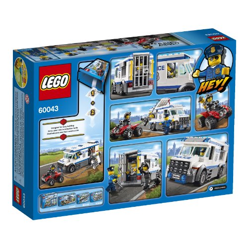 - Includes 3 minifigures with assorted accessories: a policeman and 2 crooks, Features an armored Prisoner Transporter and an ATV, Transporter features a large jail door in the rear, a hatch in the roof, 2 interior cabin doors and 2 jail bars on the side that can be ripped out, Accessories include a ball and chain, walkie talkie, handcuffs, crowbar and a key, ATV includes chain with a grappling hook, Attach the chain to the jail bars and break the prisoner out. Chase down the crooks on the ATV and put them in handcuffs., Prisoner Transporter measures 7cm high, 15cm long and 6cm wide, ATV measures over 5cm wide, 6cm long and less than 2cm high