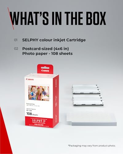 - Postcard Size: 4 x 6 inches (148 x 100 mm), paper with 108 sheets and two color inks included, Photos are instantly dry, smudge-free, and water resistant, The same great Canon quality you expect so your prints will look amazing