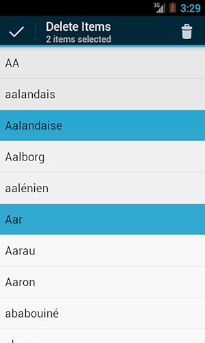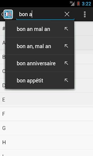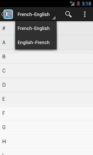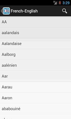 - Fully functional in offline mode, French-English with over 42,000 definitions, English-French with over 22,000 definitions, Spelling suggestions, Bookmark your favourite entries, Category-wise word list, Random words, Pronunciation via text-to-speech engine, Ability to search new words and store them in the vocabulary, Share content using various networks