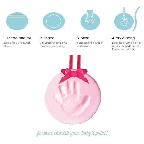 - Includes everything you need to make your baby’s adorable little print: baby safe pink impression material, shaping ring, pink ribbon, and a pin to create the hanging hole., Use the pink ribbon hang the keepsake and decorate your baby girl’s nursery, Personalize your Christmas tree decorations with this keepsake ornament that beautifully displays an impression of your cute newborn baby’s handprint or footprint., Create a wonderful keepsake featuring your baby's hand or footprint, Easy to create; no mixing, air drying, no mess, Includes no-mess impression material, rolling pin, plastic hole punch and clay shaping ring, Pink satin ribbon included to hang your ornament on the tree, Classic Round Shape