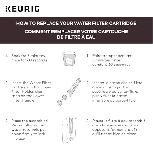- Includes one water filter handle and two replacement filters, Filters water for the perfect beverage, Uses Keurig water filter cartridge refills, Dimensions: 20.83 cm (8.2 in) High; 6.1 cm (2.4 in) Wide; 4.06 cm (1.6 in) Deep, Compatible with the K-Express, K-Slim, K-Select, K-Elite, K-Supreme, K-Supreme Plus, K-Café, and the K-Duo Plus