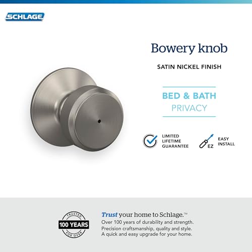 Schlage F40 BWE 619 Bowery Door Knob with Standard Trim, Bed & Bath Privacy Lock, Satin Nickel