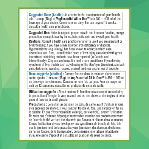 - ALL-IN-ONE NUTRITIONAL POWERHOUSE: Meet VegEssential, your new wellness assistant- an all-in-one nutritional shake that simplifies your daily wellness routine. VegEssential uses nearly 100 plant-based ingredients to deliver a broad spectrum of vital nutrients and unmatched convenience. Get all the benefits of a cupboard full of supplements in one convenient scoop., 27G PLANT-BASED PROTEIN PERFECTION: Each serving contains 27 grams of high-quality plant-based protein, offering more complete protein than four eggs—without relying on any animal sources. Perfect for those seeking to increase their daily protein intake and boost their fitness routine., A COMPLETE MEAL REPLACEMENT: In addition to protein, VegEssential is packed with vitamins and minerals to support overall health and executive functioning, Omega-3 plant oils for heart health, brain function, and healthy skin, and a full serving of greens, phytonutrients, and antioxidants to promote energy and reduce oxidative stress., FIBRE-RICH FORMULA FOR DIGESTIVE HEALTH: VegEssential provides more fibre in one scoop than a whole bowl of oatmeal, with 7 grams of both soluble and insoluble fibre. This ensures your digestive system runs smoothly, supporting overall gut health., DELICIOUS: Add one scoop to a beverage of your choice, mix well, and enjoy the great taste of VegEssential.