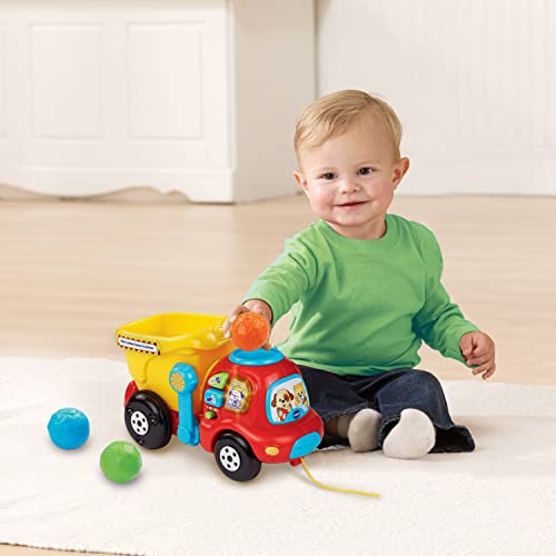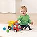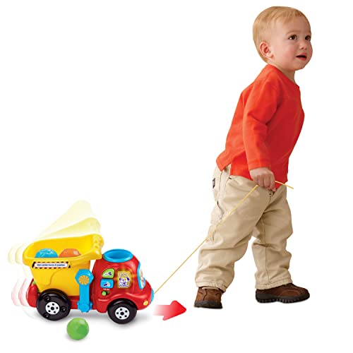- Drop a colorful rock into the top of this cheerful dump truck construction toy and watch it tumble into the bucket to explore numbers, Once the rocks are in the bucket, toddlers can push or pull the truck along to see the rocks rumble inside, Develop motor skills by lifting the hinged bucket to unload the rocks and start again, Includes three colorful buttons that play melodies, phrases and teach tools and colors, Intended for ages 6-36 months; requires 2 AAA batteries; batteries included for demo purposes only; new batteries recommended for regular use, This dump truck learning toy includes colorful pretend rocks that encourage interaction and introduce numbers