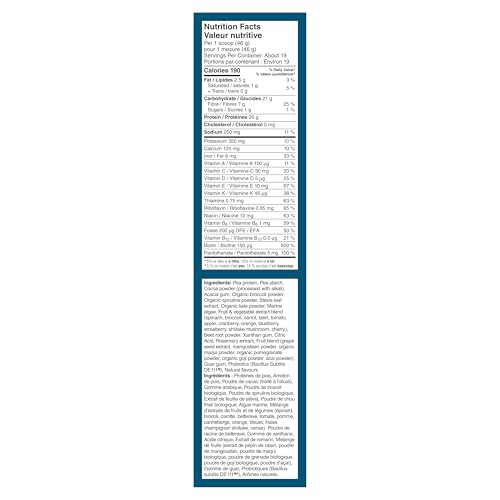 - PACKAGING MAY VARY - You may receive our fresh new label, but it's still the great taste you love., MEAL REPLACEMENT SHAKE, blend a serving of Vega All-In-One Shake with your favorite nut butter or a serving of fruit to make a delicious plant-based meal replacement smoothie for people on the go., 20G PLANT BASED PROTEIN. Pea protein, pea, sunflower seed and pumpkin seed proteins combined for a multisource, plant-based protein blend., MORE THAN JUST PROTEIN. 50% DV OF 12 vitamins and minerals per serving, plus 21% dv of fibre, 1.5g OMEGA-3 Polyunsaturates, Antioxidant vitamins a & c to help support the immune system and Probiotics from real, organic plant-based ingredients., VEGETABLES & GREENS. Proudly green, with ingredients that include organic broccoli, organic kale, chlorella and organic spirulina., SHAKE, BLEND OR BAKE. Shake with 1-1/2 cups of ice-cold water or beverage of your choice. Blend into your favorite recipe for a delicious vegan protein shake with smooth taste and texture. Bake with Vega All-In-One by swapping for 1/8 to 1/4 of the flour in sweet baking recipes.