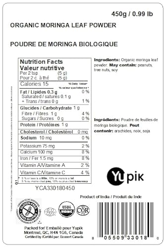 Yupik Organic Moringa Leaf Powder 450g, USDA Certified, Non-GMO, Vegan, Gluten-Free, Kosher, Nutrient-Rich Superfood for Baking, Cooking & Drinks