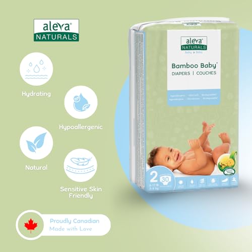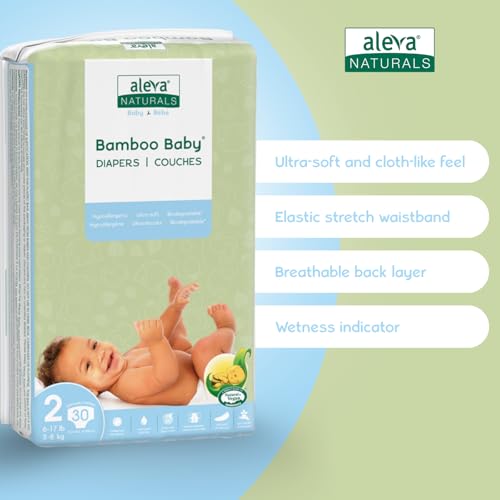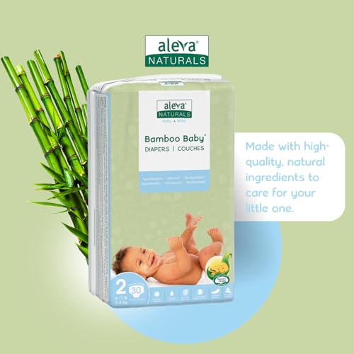 Aleva Naturals Hypoallergenic Bamboo Baby Diapers for Baby, Ultra Soft, Sensitive Skin Friendly, Biodegradable, Disposable– Size 2 (6-17 lbs/3-8 kg) | 30ct
