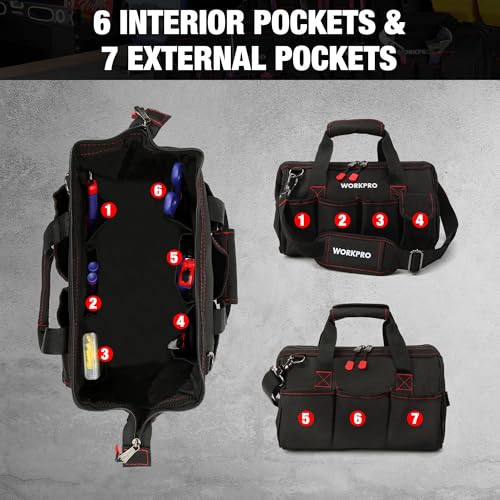 - PREMIUM MATERIALS & CONSTRUCTION:The tool bag is mainly composed of high quality black polyester fabric, providing unmatched durability and reliability, the double fabric with fine stitching of the entire tool body makes the bag extremely tough and long-lasting., MULTI-POCKETS AND LARGE INTERIOR SPACE:Designed with a large Interior space (Size: 14”x 9.8”x7.5”), this tool organizer can meet your most daily demand, and sturdy 6 pockets inside and 7 exterior pockets keep your gear organized and secure, no more digging through the bag to find., WIDE-OPEN MOUTH:Designed with wide mouth and an internal metal frame keeps the top of this bag stay-open, which makes it more convenient to put in or take out your tools quickly while needed., PADDED HANDLE & ADJUSTABLE SHOULDER STRAPS:The extra padded handle and adjustable shoulder strap can relieve hand fatigue, shoulder pressure and add extra comfort when carrying of heavy loads, you can choose a variety of ways to carry and adjust the length as you like., WIDE APPLICATON:Rubber foam bottom keeps bag sturdy, protects contents from hard falls, idel for storage of wrenches, pliers, screwdrivers and accessories. Widely used in electrical, plumbing, carpentry, automotive, home diy,ect.