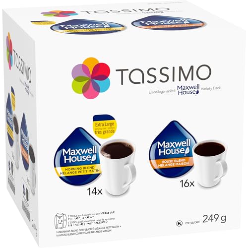 - One 249G box of Tassimo Maxwell House Coffee Variety Pack T-Discs (30 t-discs), 14 Maxwell House Morning Blend T-Discs & 16 Maxwell House House Blend T-Discs, Each T-Disc makes one 8 fl oz/236 ml cup of coffee, T-Discs compatible with Tassimo brewers, Maxwell House Coffee: Good to the Last Drop