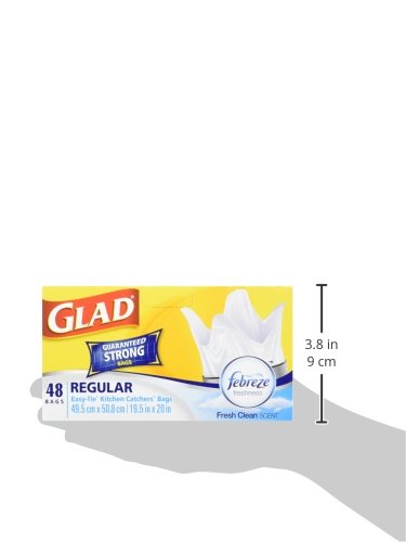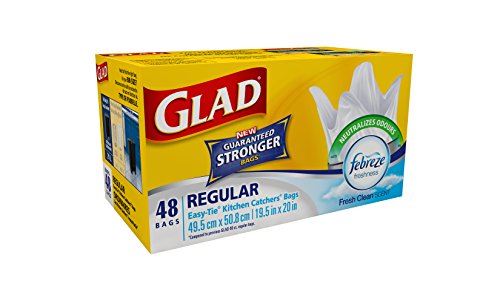 - SMALL WHITE GARBAGE BAGS: Box of 48 bags of Glad Small 25L white garbage Bags, GUARANTEED STRONG: Glad bags are guaranteed strong to handle your toughest garbage messes, FEBREZE FRESH CLEAN SCENT: Neutralizes odours and keeps your bin smelling fresh, EASY-TIE HANDLES: Four flaps designed for easy closing, making even the fullest bags simple to lift and carry, USE AROUND THE HOME: Smaller size ideal for kitchen, bathroom, bedroom or office