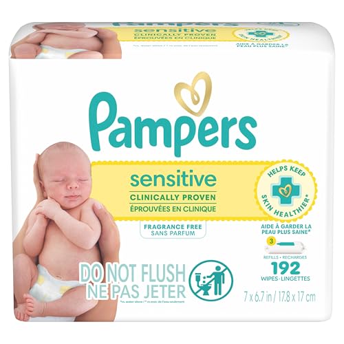 - 192 Wipes in 3 Packs of Pampers Sensitive Baby Wipes, Water Based, Hypoallergenic and Fragrance Free, HELPS KEEP SKIN HEALTHIER*: Pampers Sensitive baby wipes help keep skin healthier than WaterWipes(TM) and are clinically proven baby wipes for baby’s sensitive skin (*vs WaterWipes(TM)), SKIN-LOVING: Pampers Sensitive baby wipes help restore skin’s natural pH levels, helping to improve skin with every wipe. Skin Health Alliance Dermatologist Approved, FREE OF: Pampers Sensitive baby wipes are gentle, hypoallergenic, unscented, fragrance free, and have 0% alcohol, fragrance, parabens, and latex* (*No rubbing alcohol and no natural rubber latex), TRUSTED BY THE ONES YOU TRUST: Pampers Sensitive baby wipes are from Pampers, the #1 choice of hospitals** and the #1 pediatrican recommended brand (**based on hospital sales data)