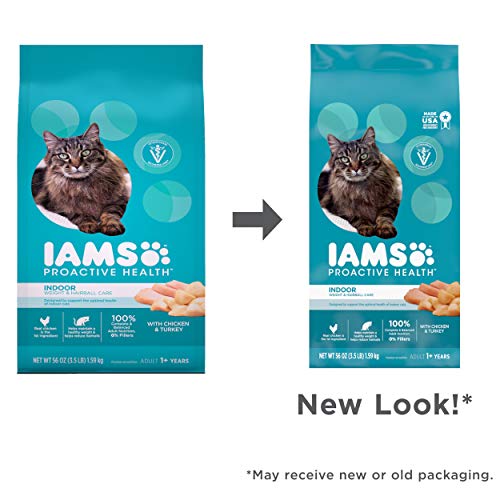 - IAMS PROACTIVE HEALTH Indoor Weight & Hairball Care, a 1.59KG bag of adult dry cat food, CHICKEN & TURKEY RECIPE with prebiotics, beet pulp and L-carnitine, PREVENTS HAIRBALLS FROM FORMING and helps your indoor cat maintain a healthy weight, 100% COMPLETE & BALANCED CAT FOOD with zero fillers, FEEL GOOD WITH IAMS, and trust that you’re giving your cat the nutrition they need