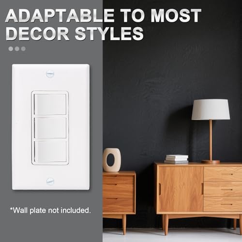 - 【Space-Saving Design】- Single-gang unit combines three independently controlled switches in one compact wall box, 【Durable Construction】- Steel spring mechanism ensures smooth, quiet operation, 【Modern Glossy Finish】- Sleek white design complements most decor style, 【Wide Compatibility】- 15A/120V rating works with LED/CFL/incandescent/halogen bulbs, 【Safety Certified】- UL/CUL Listed, meets U.S. electrical standards