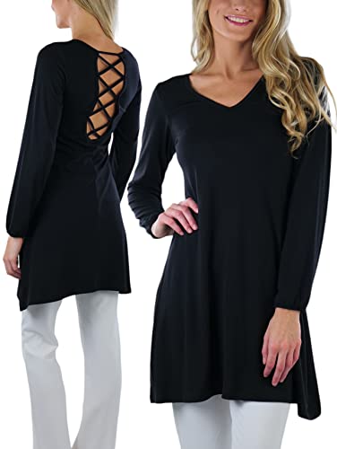 - Flared Mini-Dress. Strappy Crossback Design. V-Neck. Elasticized Cuff., Materials: 67% Polyester, 28% Rayon, 5% Spandex, Machine wash cold with like colors, do not bleach, hang dry, Sizes: Small to Large. Measurements from Size Small - Body Length: 33", Chest: 29"., Colors: Black and Charcoal