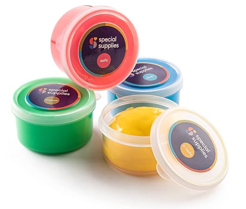 - Stretchy Soft Therapy Putty – This hand therapy putty is designed to stimulate your hands and fingers while improving strength by allowing you to stretch, pull, pinch, twist, and smush it for endless fun and relaxation., Fun Colors – Every set of our therapy putty for adults and teens comes with 4 individual containers of putty, each with its own brilliant color. This makes it easier for color-coded therapy or rotating their daily use., Strengthens Hand Muscles – Occupational therapy putty is a great way to strengthen the joints and muscles in your hands and fingers while providing a tactile sensory experience that stimulates fine motor development or injury recovery., Keep our stretchy soft putty with you when you’re traveling, at work, or wherever you need to keep your mind focused and your hands busy., Non-Toxic, High-Quality Silicone – Special Supplies hand putty is made with premium silicone instead of natural rubber latex, which makes it gentler on sensitive skin or those with skin allergies It’s also much safer for teens!