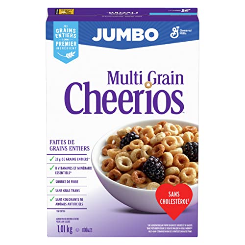 - BREAKFAST CEREAL: Jumbo Size Multi Grain Cheerios Cereal provides a wholesome and delicious option to start your day; Perfect for breakfast with milk, as an afternoon snack, or added to your favourite trail mix or cereal bars, MULTI GRAIN FLAVOUR: Made with whole grain oats, whole grain corn, and whole grain rice and toasted before being lightly sweetened; A family favourite perfect for kids, adults, and everyone in between, DELICIOUS SNACK: In each serving, this cholesterol free cereal includes 22 grams of whole grains, two grams of fibre, and eight essential vitamins and minerals; No artificial flavours or colours, PANTRY FAVOURITE: A pantry and kids snacking favourite; Perfect addition to your weekly groceries and on-the-go snack, CONTAINS: 1.01 kg, one ct