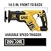 - DEWALT 20V reciprocating saw has up to 2.5x more runtime, Compact 14.5-inch length fits in between studs and in other tight spots, Only 5 lbs. in weight (tool only), Keyless 4-Position Blade Clamp for quick and easy blade changes and cutting versatility, 1-1/8-inch stroke length, Variable speed trigger delivers up to 2,900 SPM, Bright LED light to illuminate dark work areas