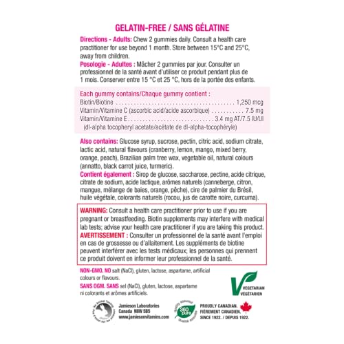 - HIGH POTENCY: 2,500 mcg of biotin per serving, which is a factor in the maintenance of good health. Chew 2 delicious gummies daily, HAIR, SKIN, NAILS: Promotes thicker hair, healthier skin, and stronger nails Also helps improve splitting and brittle fingernails, 3 DELICIOUS NATURAL FLAVOURS: Jamieson Biotin Gummies are vegetarian friendly and made from all natural flavours and colours. Contains 3 natural flavours: mango peach, sweet lemon, and fruit punch, PURELY FORMULATED: Non-GMO, Gluten-Free, Lactose-Free, No Artificial Colours, Flavours, or Preservatives
