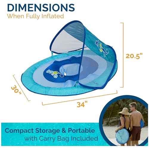 - BABY POOL FLOAT: Features a soft mesh seat with secure leg holes so baby can kick freely underwater as well as a mesh play space so your little one can splash and play with pool and water toys, PATENTED INNER SPRING DESIGN: Inner spring sewn along the edge of the outermost inflation chamber of the float provides a comfortable and secure water introduction experience, ADJUSTABLE SUN CANOPY: Removable sun canopy offers a shady spot with UPF 50+ sun protection, and the mesh sides allow you to maintain eye contact with your baby at every angle, SAFE AND SECURE: Fabric-covered inflation offers added durability, while the wide base, child safety valves, and dual air chambers ensure security, INCLUDES REUSABLE CARRYING BAG: Measures 34"L x 30"W x 20.5"H and folds flat into 3 compact circles to fit in the included carrying bag, and it is recommended babies age 9-24 months, Includes: Baby Spring Float Sun Canopy, Carry Tote, Covered by the Spin Master Care Commitment. See below for full details