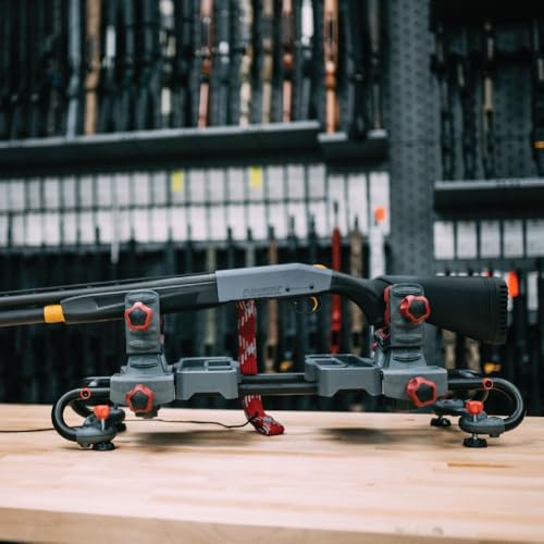 - Solvent-Resistant and rigid steel frame to stand up to years of hard use, Over-Molded rubber contact pads throughout the device to prevent damage to your firearms or bows, Works with rifles, break open shotguns, handguns, muzzleloaders, compound bows, crossbows and hand guns, Ideal for cleaning, gunsmithing, scope mounting and firearm and bow maintenance, 2 accessory trays that can be rearranged or removed. Engineered glass filled nylon construction