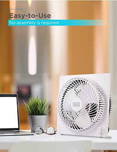 - BOX FAN FOR DESK OR TABLE The small, compact size (10.9 x 4.25 x 10.9) of this mini electric fan fits perfectly on desktops, table tops, and counters - making it ideal for fast, personal cooling in bedrooms, offices, garages, RVs, and dorms., SMALL PORTABLE FAN - The slim, square design is uniquely frameless, so it doesn 't take up too much space on bedside tables and office desks, and even sits on windowsills. Lightweight (3.97 lbs.), it can easily be moved around the home., QUIET, 3 SPEED AIR CIRCULATION Customize the airflow exactly the way you like it at home or work with High, Medium, and Low settings. Stay cool and comfortable on hot, humid days without distracting noise., EASY TO USE and ACCESS CONTROL PANEL Just plug it in and create your own personal cool breeze in seconds! No assembly is required. The settings of the 9-inch durable blade are adjusted quickly + simply right from the front bottom corner of the box., GUARANTEED SATISFACTION – BLACK+DECKER products come with a one-year warranty for parts and labor, so you can feel confident with your purchase.