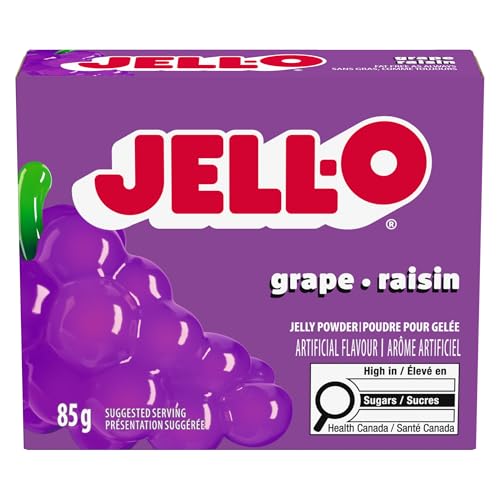 - GRAPE JELL-O: One 85 g box of Jell-O Grape Jelly Powder Mix, FAT-FREE TREAT: Jell-O Grape Jelly Powder is fat-free, 70 CALORIES: Contains 70 calories per serving, DELICIOUS GRAPE DESSERT: A sweet treat on its own as well as a perfect ingredient for fruity desserts, QUICK AND SIMPLE RECIPE: To prepare, stir 1 cup (250 mL) boiling water into jelly powder, stir until completely dissolved, stir in 1 cup (250 mL) cold water or fruit juice and chill until set, MAKES ABOUT 4 SERVINGS: Each 85 g box makes about 4 servings, Prepared in Canada